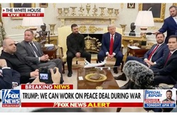 Despite initially welcoming Trump's negotiations with Putin, Zelensky backtracked shortly before arriving in the US, reverting to his prior positions on numerous points, including territorial concessions and a ceasefire. Flanked by von der Leyen, Zelensky said, "Putin has many demands, but we do not know all of them. And if there are really as many as we heard, then it will take time to go through them all. It's impossible to do this under the pressure of weapons." He continued, "So, it's necessary to ceasefire and work quickly on a final deal." He also insisted that territorial concessions to the Russian Federation are "impossible" under Ukraine's constitution. "The constitution of Ukraine makes it impossible, impossible to give up territory or trade land," he said. (Screengrab image: via Fox News)