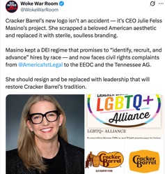 "...Cracker Barrel is infested with DEI & wokeness. ... Another little known fact: Cracker Barrel was a Nashville Pride sponsor. Do you want your $ to fund Pride events when you go to" Cracker Barrel? -Heritage Foundation visiting fellow and brand investigator, Robby Starbuck