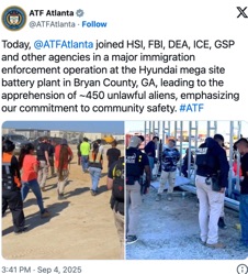 [DailySignal.com] Around 450 illegal aliens have been arrested at a Hyundai manufacturing site in Georgia, according to federal immigration officials on Friday. (Screengrab image: via X-ATF Atlanta)