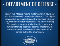 As I reported on Friday, Venezuela's illegitimate president, Nicolás Maduro, flew two of his regime's aircraft close to one of the United States Navy warships currently patrolling the southern Caribbean Sea near Venezuela's borders. The newly named Department of War responded with a verbal warning and by sending 10 F-35 fighter planes to Puerto Rico.