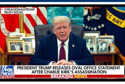 "...I ask all Americans to commit themselves to the American values for which Charlie Kirk lived and died, the values of free speech, citizenship, the rule of law and the patriotic devotion and love of God. Charlie was the best of America, and the monster who attacked him was attacking our whole country, an assassin tried to silence him with a bullet, but he failed, because together, we will ensure that his voice, his message and his legacy will live on for countless generations to come." -President Donald Trump