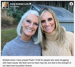 In a Facebook post on Tuesday, Lotz explained her daughter was rushed to the hospital on Saturday after she suffered a heart attack. "Multiple times I have prayed Psalm 73:26 for people who were struggling with heart issues: 'My flesh and my heart may fail, but God is the strength of my heart and my portion forever,'" Lotz wrote. "I am now driving the stake of my faith down deep into this promise for my daughter, Rachel-Ruth. She was rushed to the hospital on Saturday night with a heart attack, followed by a catheterization. Sunday afternoon, she had a second heart attack, followed by another catheterization," she explained. "The mystery is that her heart has no blockages which can cause traditional style heart attacks. Hers is a very rare condition one doctor described as a 'broken heart syndrome.' There is no known cause," Lotz noted. "As I write this she is still in the hospital and will be for several more days as they continue to run tests." "I am urgently asking you to join my family in praying for Rachel-Ruth. Please pray for her heart to stabilize; for accurate diagnosis and treatment; for the doctor's supernatural wisdom; for peace and comfort for all of us," the sister of evangelist Franklin Graham wrote. In addition to asking for prayer for her daughter, Lotz also shared an encouraging Scripture from the Bible's Old Testament with her Facebook followers. "The lead verse in today's Daily Light from Psalm 103 was very encouraging...'Bless the Lord, O my soul...Who redeems your life from destruction, Who crowns you with lovingkindness and tender mercies,'" she concluded. As CBN's Faithwire reported last July, Lotz's son Jonathan Lotz was hospitalized in critical condition from COVID. He was in the ICU at a local hospital for eight days before finally being released to go home. Lotz has dealt with her own share of health issues in the past, ultimately crediting God with healing her cancer. Please continue to keep Rachel-Ruth and the Lotz family in your prayers. Subscribe for free to Breaking Christian News here