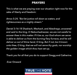 True the Vote Arrest Update; How You Can Pray, from Intercessors For America"Trust, honesty, and respect will always be our highest values, regarding both our work and our lives. As a result, we will be held in jail until we agree to give up the name of a person we believe was not covered under the terms of the judge's TRO. We ask that you keep us in your prayers. Thank you to those who continue supporting and believing in us and our mission to make elections safe for all parties and for all people." -Catherine Engelbrecht