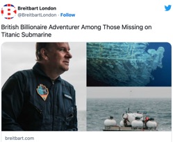 [Breitbart.com] Sonar buoys deployed to help search for a submarine that went missing while diving to the wreck of the Titanic have detected "underwater noises", prompting a shift in the search area, but the time left to save lives based on the oxygen supply aboard is nearly up ... The noise has been described as "banging sounds in the area every 30 minutes". UK broadcaster GB news goes further, citing unnamed "well connected sources" who allegedly say the banging is in fact the sound of 'SOS' being tapped out in Morse code... Subscribe for free to Breaking Christian News here Click Here to read. (Screengrab image: via Twitter)