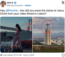 [Faithwire.com] Despite its impressive size, viewers couldn't see an enormous statue of Jesus in the original version of a newly released Porsche ad—because the famous sculpture was digitally erased. (Screengrab image: via X)