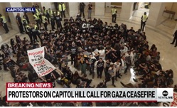 [Breitbart.com] Pro-Palestinian protesters, who want a ceasefire that would benefit the Hamas terrorist organization in Gaza, stormed the US Capitol on Wednesday and staged a protest inside the Cannon Rotunda that one observer likened to an "insurrection" ... Fox 5 in Washington, DC reported: "...US Capitol Police say demonstrations are not allowed inside Congressional Buildings and are working to clear the crowd. Police have already detained some individuals as chants of 'ceasefire' are echoing around the building" ... Subscribe for free to Breaking Christian News here Click Here to read, and view videos of the insurrection. (Screengrab image)