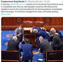House Speaker Mike Johnson 'Radiates the Love of Jesus,' Say Fellow Conservatives"In January, [Rep. Mike Johnson] joined me on the House floor while we were in a deadlock over who our next Speaker would be. We lifted up the speaker's race to the Lord and asked for His divine guidance. Immediately after the prayer, 14 members changed their votes, ultimately leading to Speaker McCarthy securing the gavel by the end of the day. Mike Johnson is a strong conservative, but above all else, he is a strong Christian. He's not afraid to look to his faith for guidance. America needs that more than ever in the US House.†-Rep. Greg Steube (R-FL)