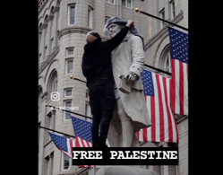 In Lafayette Park, protestors placed Palestinian flags on statues of Andrew Jackson, Count Rochambeau, and the Marquis de Lafayette, whom they also covered with posters. Protestors graffitied at least four statues in Lafayette Park—General von Steuben, General Kosciuszko, Rochambeau, and Lafayette—with the message "Free Palestine," which remained on the statues as of Monday afternoon. Rochambeau's statue, in the southwest corner of the park, was also graffitied with messages such as, "Stop genocide in Gaza, free Gaza, Palestine will be free, and F*** Joe Biden." Graffiti messages on other structures in Lafayette Park which remained until Monday included "Death to USA," "Amerikkka = pigs," "Destroy empires," "Kos om Israel" [according to Google translate, Arabic for, "who is Israel?"], "Israel is a b****," "T***** f*** [crude ways to describe people who identify as LGBT] 4 Palestine," anarchist symbols, and, "Free Ireland." Protestors also affixed stickers with messages including, "Community watch area, police not welcome" and "Every time media lies a neighborhood in Gaza dies." Some of the messages were written in red paint, smeared to resemble blood. Over an information board describing the history of the Dwight D. Eisenhower Executive Office Building, the word "Gaza" was sprayed in large, red letters. The US Secret Service and other law enforcement maintained a heavy presence near Lafayette Park on Monday, with an extra 40 police vans and SUVs parked in an area of Pennsylvania Avenue often open to pedestrian traffic. Police had completely blocked off the avenue in front of the White House, the apex of the protest, while crews with pressure washers were still employed cleaning off the White House fence. The pro-Hamas protestors did not confine their destructive actions to the White House complex. Across 17th Street from the White House, demonstrators spray-painted "Gaza" on the windows and broke one. Despite the damage, the McDonalds was open for business on Monday. Blocks away from the White House, protestors vandalized a bus stop with the messages, "Kill the empire" and "Free Palestine," as well as stickers demanding, "Resist colonial power by any means necessary." The message echoes the words of senior Hamas official Ghazi Hamad who argued last month, "We are the victims of the occupation. Period. Therefore, nobody should blame us for the things we do. On October 7, October 10, October 1,000,000—everything we do is justified." "For generations on our elite college campuses ... we've been teaching young people to look at the world through the worldview of critical theory ... that fundamentally sees the world through the lens of 'oppressor' and 'oppressed,' said David Closson, director of Family Research Council's Center for Biblical Worldview, on "Washington Watch." "Part of that also is this ideology of settler colonialism ... this idea that the Jews, the Israelis, somehow don't actually have a moral claim to their land, and because of that their enemies ... can use any means whatsoever to evict them from the land." "We have now turned a corner into a place where we are kind of excusing, justifying, trying to understand mass rape, mass murder, putting babies in ovens, because the people who are doing it have been identified as the oppressed," lamented Joseph Backholm, senior fellow for Biblical Worldview and Strategic Engagement at Family Research Council and guest host of "Washington Watch." "We saw this in the US in the 'Summer of Love' of 2020, where we saw people rioting and looting and destroying their neighbors' businesses," Backholm continued. He referenced the infamous headline, "mostly peaceful protests," which a mainstream media outlet ran in front of a burning building. When "we defined people and categorized them based on their skin color," he said, a subtle effect was "changing the moral framework that we use to determine what is right and wrong." Protestors also tore down posters of the Israeli victims kidnapped by Hamas and replaced them with more "Murdered by Israel" posters. They placed posters and stickers on parking meters and utility boxes with messages such as, "Zionism is terrorism" and "There is only one solution: Intifada! Revolution!" Protestors placed flyers on car windshields falsely claiming, "Palestinians in Gaza are facing genocide at the hands of the Israeli government, and the United States is funding it." The flyer included a QR code and web address for New York City Democratic Socialists. Despite the destructive actions of protestors, the response by law enforcement was extremely limited. DC Police said in a press release that only one person was arrested for Destruction of Property in the 700 block of 17th Street NW—this is the location of the vandalized McDonald's. They were also "investigating acts of vandalism" to a metro station near the White House and "several police vehicles." Meanwhile, US Secret Service officers made no arrests. "As of now, no arrests have been made by Secret Service personnel," confirmed Secret Service communications chief Anthony Guglielmi. "The attempted gate trespass from earlier was handled without incident." According to this statement, an "attempted gate trespass" is not an incident. Under DC Code, it is unlawful "to write, mark, draw, or paint" without the owner's consent on any public or private property, including statues, monuments, and fencing. The penalty for doing so is a fine up to $1,000 and "not less than $250," as well as jail time up to 180 days. The penalty for breaking or destroying private property exceeding $1,000 is a fine up to $25,000 and imprisonment up to 10 years. "I never envisioned we would see mobs at the gate of the White House chanting, 'Allahu Akbar,'" said Family Research Council President Tony Perkins. US officials have warned of a heightened risk of radical Islamist terror attacks inside the United States, due to the porous nature of the southern border. US Border Patrol recentl