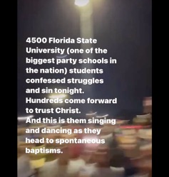 'God Keeps Doing It!!': Thousands Turn to Jesus at #2 US Party School, Hundreds Get Baptized in Fountain"4,500 Florida State University (one of the biggest party schools in the nation) students confessed struggles and sin tonight. Hundreds came forward to trust Christ ... We baptized hundreds in a fountain usually used for partying and worse. And it's all just the beginning. It literally is everywhere I go right now. Revival is here. And there is no explaining it—when it's God!" -Jennie Allen
