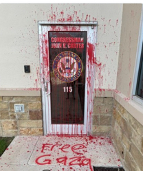 "Unhinged anti-Israel activists vandalized my Georgetown office," Rep. Carter reported in a social media post, providing a photo of his office defaced with red paint and the words "Free Gaza." "Let me make 2 things clear," Carter wrote in a message to the vandals and anyone else wanting to intimidate him from his support of Israel as it fights to eliminate the terrorist organization Hamas that attacked Israel last October 7, killing 1,200 and raping women and children: