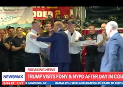[RedState.com] Donald Trump dropped by a New York Fire Department station in midtown Manhattan Thursday to deliver pizzas after spending another day in court for DA Alvin Bragg's case against the former president for falsifying business records. The firefighters appeared to be pleased to see him, and in the video you can hear one or more say, "Save us, please save us." I think it's quite apparent who they want saving from... Click Here to read and watch the videos. Subscribe for free to Breaking Christian News here (Screengrab image: via Newsmax)