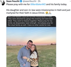 [NYPost.com] Missouri state Rep. Ben Baker's daughter and son-in-law were shot and killed in a gang attack while serving as missionaries in Haiti, the politician said Friday. "My heart is broken in a thousand pieces. I've never felt this kind of pain," the Republican lawmaker wrote on Facebook. Baker's daughter, Natalie, and her husband, Davy Lloyd, died when they were "attacked by gangs" on Thursday evening, Baker claimed... Subscribe for free to Breaking Christian News here Click Here to read. (Screengrab image: via X)