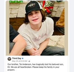[ChurchLeaders.com] Tai Anderson, the former bassist and long-time member of the Grammy Award-winning Christian rock group Third Day, shared the tragic news that he lost his son Eli last month. Anderson lost his daughter Mackenzie in 2018. "Our brother, Tai Anderson, has tragically lost his beloved son, Eli," Third Day posted on social media. "We are all heartbroken. Please keep his family in your prayers. If you'd like to contribute, a gofundme has been set up in Eli's name to help cover the extensive medical bills, memorial costs and ongoing family grief support"... Subscribe for free to Breaking Christian News here Click Here to read. (Screengrab image: via Facebook-Third Day)
