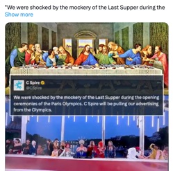 BCN Editor's Note: An interesting thing was reported about 24 hours after the disgusting display of the Olympic opening; Paris lost power. X users posted images of the Parisian skyline plunged into darkness with one exception: the "Basilica of the Sacred Heart of Jesus" on the summit of Montmartre Butte was the only structure that was still lit up, according to a post by Sr. Mary Joseph Calore, SSCJ on X. (Click here to view) She noted, "God is in control..." -Aimee Herd, Breaking Christian News [CBN News] The opening ceremonies of the Paris Olympics mocked the sacred Last Supper of Jesus Christ with a blasphemous drag queen presentation over the weekend, fueling global outrage that finally forced Olympics organizers to issue a partial apology on Sunday. (Screengrab image: via X) Paris 2024 spokesperson Anne Descamps claimed on Sunday, "Clearly there was never an intention to show disrespect to any religious group... If people have taken any offense we are, of course, really, really sorry." Christians around the world were stunned by the disturbing image of seeing a sexualized recreation of Leonardo da Vinci's famous "The Last Supper" painting. From the Speaker of the House to billionaire Elon Musk to evangelist Franklin Graham, condemnation was swift and severe. Graham warned, "Even more than being disrespectful to Christians, I would be concerned about being disrespectful to God. His Word tells us, 'Be not deceived, God is not mocked' (Galatians 6:7). Whether you're Catholic, Orthodox, Anglican, or Protestant, it is offensive." SpaceX, Tesla and X owner Musk called it "extremely disrespectful to Christians." House Speaker Mike Johnson (R-LA) posted, "Last night's mockery of the Last Supper was shocking and insulting to Christian people around the world who watched the opening ceremony of the Olympic Games. The war on our faith and traditional values knows no bounds today. But we know that truth and virtue will always prevail. 'The light shines in the darkness, and the darkness has not overcome it.' (John 1:5)" Even Christian Actress Candace Cameron Bure felt compelled to comment on the monumental mockery of the faith.