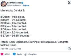 ...Earlier, the primary election in Minnesota [had] taken a dramatic turn as social media explodes with questions about the conspicuous delay in reporting results from the state's 5th Congressional District, home of one of the squad members of Congress, Ilhan Omar... Polling places across the state opened at 7 a.m. and remained open until 8 p.m., with every eligible voter in line by the cutoff guaranteed their chance to cast a ballot. Yet, more than an hour after the polls closed, every district except Omar's had already reported their initial results. The absence of any updates from the 5th District has only fueled suspicions and questions about the integrity of the process... Subscribe for free to Breaking Christian News here Click Here to read this article in its entirety.