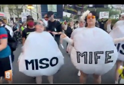 [Breitbart.com] People protesting the Democratic National Convention (DNC) were seen marching through the streets of Chicago dressed as abortion pills. Video footage posted on X showed protesters dressed in white outfits, appearing to look like abortion pills with the words "MIFE" and "MISO" written on them. "MIFE" stands for mifepristone, which is "the first of two medications used in a medication abortion"... Subscribe for free to Breaking Christian News here Click Here to read. (Screengrab image: via Breitbart News)