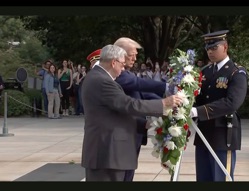 [FoxNews.com] A US veteran and former member of the Presidential Honor Guard defended former President Trump's appearance at Arlington National Cemetery this week amid reports of an altercation between Arlington staff and the Trump campaign. The veteran, Lucas O'Hara, said on social media that he worked at Arlington for three years during his time in the military, and he lauded Trump's composure at the event. "I have witnessed over 75 wreath laying ceremonies performed by politicians and conducted 524 funerals in this cemetery during the time I served in the Presidential Honor Guard for three years. What I got to witness yesterday was the most respectful and solemn ceremony I have seen. There were no speeches, no angles, no weird photo ops just our elected officials and the 45th President respectfully and solemnly honoring the fallen and their families."... Subscribe for free to Breaking Christian News here Click Here to read. (Screengrab image: via PBS)