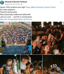 [WashingtonStand.com] A Gospel outreach gathering at the Corpus Christi campus of Texas A&M University last Thursday drew approximately 1,500 attendees, with dozens of students baptized. New Life Church pastors Michael and Bonnie Fehlauer posted to their joint Facebook account last week a brief report on the campus gathering organized by New Life Young Adults, a ministry of the church also a recognized student organization at the Texas A&M Corpus Christi campus ... “It was all Jesus-based, all focused on Him,” said one attendee of the OSU event in an earlier interview with CP. “Person after person came. You could just see the Spirit moving in people. It was different, nothing I’ve ever experienced before.”... Subscribe for free to Breaking Christian News here Click Here to read. (Screengrab image: via Facebook)