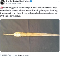 [Breitbart.com] An ancient sword that may have belonged to the army of the Egyptian pharaoh whom Moses liberated the Israelites from in the Old Testament was unearthed by archaeologists, officials say. The bronze weapon was found in an excavation site in the Hosh Issa district of Beheira Governorate, in the northern part of the country, Egypt's Ministry of Tourism and Antiquities said in a September 4 press release... Subscribe for free to Breaking Christian News here Click Here to read. (Screengrab image: via X-The Calvin Coolidge Project)