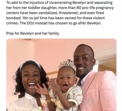[LifeNews.com] Bevelyn Beatty Williams turned herself in to federal prison on Wednesday after the Biden-Harris Department of Justice charged her with violating the Freedom of Access to Clinic Entrances (FACE) Act for preaching the Gospel outside of a New York abortion facility. Before surrendering herself into federal custody, Wiliams and her husband, Ricky Williams, released a video on Facebook and TikTok detailing how the ordeal has affected their family. "Thanks to the Biden/ Harris administration. My husband is becoming a single father today," wrote Williams. "While I turn myself into federal prison for 3 1/2 years for unlawful assembly. The 'Pro' black presidential candidate and vice president is destroying a black family and could[n't] care less about it"... Subscribe for free to Breaking Christian News here Click Here to read. (Screengrab image: via X)