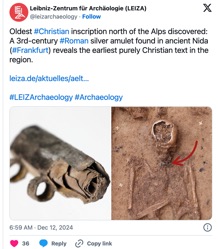 "Researchers have used CT scans to 'digitally unroll' the 'wafer thin' foil and read the inscription within for the first time since the 3rd century AD," reports the Daily Mail. "Incredibly, the text represents the oldest known evidence of Christianity north of the Alps, dating back to between 230 and 270 AD, scientists say." While similar amulets from the 3rd through 5th centuries included mixtures of Jewish, Christian, and pagan texts (presumably because the wearer wanted to avoid missing out on the afterlife in any religion they knew of), the scientists behind this discovery refer to the inscription as "purely Christian." The text is in Latin, which also surprised researchers, and refers to Jesus as well as St. Titus, an early church leader. The trick to discovering what was on the inscription and translating it was that the delicate foil roll had been buried for 18 centuries. The staff at the Leibniz Center for Archaeology (LEIZA) in Mainz, Germany, and Frankfurt's Goethe University spent the last six years working on it. "The discovery of a Roman silver amulet is changing our knowledge of the early spread of Christianity: the 3.5 centimeter amulet from the 3rd century AD, discovered in the Roman city of Nida near Frankfurt, contains one of the oldest purely Christian inscriptions north of the Alps," announced LEIZA in a press release (translated from German). "The challenge in the analysis was that the silver sheet was rolled, but after around 1,800 years, it was of course also creased and pressed," Ivan Calandra, an archaeologist at LEIZA, said. "Using CT, we were able to scan it at a very high resolution and create a 3D model." CT and X-ray technologies allowed scientists to scan the inscription and piece it together. Even though there were some gaps in the texts, scholars were able to translate them. "I called in experts from the history of theology, among others, and we approached the text together, piece by piece, and finally deciphered it," Prof. Markus Scholz of Goethe University said. The amulet strongly suggests that the wearer was a devout Christian because it doesn't include any references to Jewish theology or pagan practices. It's also noteworthy that the inscription is in Latin because most similar inscriptions from this era were in Greek or Hebrew. The inscription also contains a direct reference to Philippians 2:9-11, which reads, "Therefore God has highly exalted Him and bestowed on Him the name that is above every name, so that at the name of Jesus every knee should bow, in Heaven and on earth and under the earth, and every tongue confess that Jesus Christ is Lord, to the glory of God the Father."... Subscribe for free to Breaking Christian News here Click Here to continue reading and to see a translation of the discovered text.
