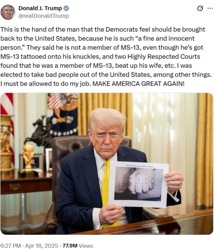 Edited or Not, Trump's Knuckle-Tattoo Photo Captions the Obvious: Abrego Garcia Is a MS-13 Gang Member"Ask any law or immigration enforcement official who's been on the ground about Kilmar Abrego Garcia's tattoos: they're MS-13. An ICE investigation, a local police investigation, and the government of El Salvador have all determined that he is a wife-beating, MS-13 terrorist, illegal alien who should never have been in the United States. There is no dispute about these facts." -White House spokesman Kush Desai