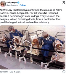 Trump's NIH Shuts Down Final Beagle Lab Conducting Painful Experiments; Ending Fauci-Era Cruelty and Bureaucratic Waste...White Coat Waste Project, using the Freedom of Information Act, revealed that Fauci spent $424,000 to commission another study in which healthy beagles were given an experimental drug and intentionally infested with flies that carry a disease-causing parasite that affects humans. The researchers [were] developing infections in 28 beagles and allowing them to suffer for three months before being euthanized. The report from White Coat Waste Project explained that records show that the dogs were "vocalizing in pain” during the experiments...