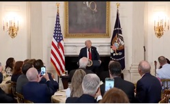 [ChristianPost.com] President Donald Trump and the White House Faith Office hosted the inaugural Summit of Faith and Business Leaders on Monday to celebrate what he calls "core values that built this country," which include "freedom, hard work, risk-taking, and above all, trust in Almighty God." Held in the State Dining Room, the event was attended by dozens of CEOs and business leaders, honoring those who have donated to faith-based charities. ... "From the earliest days of our republic, the steady compass of faith has guided the strong hands of American workers, builders and entrepreneurs like really no other," [Trump] said. "Our country was founded by pilgrims and Believers. And every generation since, Americans of faith have built our communities and forged new industries and enriched our country by millions and millions of people and ways."... Subscribe for free to Breaking Christian News here Click Here to read. (Screengrab image: via YouTube-DRM News)