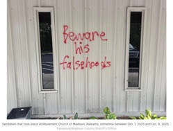 [ChristianPost.com] A church in Alabama was defaced by vandals days after announcing its decision to host a Turning Point USA event. The Movement Church of Madison was the target of an attack by an individual or group of vandals who spray-painted the words "Bryan Dawson serves the antichrist" and "Beware his falsehoods" on the exterior of the church building sometime between Tuesday evening and Wednesday morning, according to authorities. ... "Detectives are actively reviewing all available evidence and are encouraging residents and business owners in the area to check their security cameras or doorbell footage for any suspicious activity that may have occurred during the timeframe of the incident," stated authorities... Subscribe for free to Breaking Christian News here Click Here to read. (Screengrab image: via Christian Post /Facebook-Madison County Sheriff's Office)