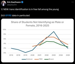 "Trans identification is in free fall among the young," author and commentator Eric Kaufman wrote on X above a chart showing the plummeting numbers of "Students Not Identifying as Male or Female" at select college campuses. "Non-conforming sexual identity (queer, questioning, etc.) is also in sharp decline," Kaufman noted in his X thread, adding that the numbers of those identifying as "Gay and lesbian are stable while heterosexuality has rebounded by around 10 points since 2023." "Not only this, but freshmen in 2024-25 were less trans and queer than seniors whereas it was the reverse when BTQ+ identity was surging in 2022-23. This suggests that gender/sexual non-conformity will continue to fall," Kaufman predicted... Subscribe for free to Breaking Christian News here Continue reading, and view charts Here.