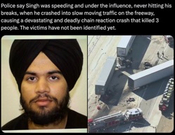 Despite the Trump administration implementing new rules requiring truck drivers to test for English language proficiency, California Democrats have stubbornly refused because they always prioritize law-breaking foreigners over American citizens. Unfortunately, that allowed one law-breaking foreigner to kill three Americans in a deadly DUI crash. So this tragedy was entirely preventable if only Democrats had enforced the law, first, by not allowing Singh into the country, and second, by not allowing him to be a truck driver. Fox News national correspondent Bill Melugin added more details. Singh has not been officially charged but is in custody with the San Bernardino County Sheriff's Department on suspicion of driving under the influence (DUI), "causing great bodily injury and gross vehicular manslaughter while intoxicated." Singh sped into slow-moving traffic without ever using his brakes in his semi-truck and set off a fiery and deadly chain reaction that left three people dead. Recommended: Portland Soccer Club Backer an Antifa Ringleader? Again, this should never have happened, not only because Singh should have made better choices, but because he should never have been in the United States to make any choices... Subscribe for free to Breaking Christian News here Continue reading Here.