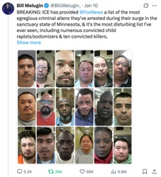 These Are the 'Vulnerable Neighbors' the Dem-Left Wants to Shield from ICE: Illegal-Alien Rapists, Child Rapists, Murderers..."It's the most disturbing list I've ever seen, including numerous convicted child rapists/sodomizers & ten convicted killers, most with deportation orders going back many years." -Bill Melugin via X