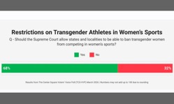 The Voters' Voice Poll found that 68% of registered voters support allowing the Supreme Court to uphold state bans on transgender women competing in women's sports. The Center Square Voters' Voice Poll was conducted by Noble Predictive Insights between March 2-5, 2026. The poll sample included 2,659 respondents, comprised of 952 Republicans, 934 Democrats, and 773 Independents, of which 330 are True Independents, which Noble Predictive refers to as independents who, when asked if they leaned toward one of the major parties, chose neither. It is among the most comprehensive tracking polls in the country. Across partisan lines, a clear divide emerged between Republicans and Democrats. About 88% of Republican voters supported upholding state bans on transgender women competing in women's sports whereas 49% of Democrat voters said the same. Mike Noble, founder of Noble Predictive Insights, said the debate over transgender athletes is a "wedge issue" where Republicans have an advantage. About 49% of independent voters supported transgender sports bans, with 65% of true independents agreeing on the issue. "Democrats seem really out of touch with those political folks in the middle of the aisle," Noble said. "Republicans have been smart to keep going after this because this is a wedge issue for Democrats." About 51% of Democrat voters said they would not support the US Supreme Court upholding state bans on transgender women competing in women's sports. Only about 35% of true independents said the same. In January, justices on the US Supreme Court appeared skeptical of allowing transgender women to compete in girls' and women's sports. The court heard challenges to laws in Idaho and West Virginia barring transgender athletes from competing in recreational and college sports. Currently, 27 states have laws or restrictions that prevent transgender women from competing in girls' and women's sports. The court is expected to issue a decision in the transgender athlete cases by July. Noble said the outcome in the case could affect how other states legislate with transgender athletes. "I think this is really important in the swing states of what elected officials are doing and I could see some Democrats potentially moving on this issue pending the court outcome," Noble said. Interestingly, Noble found a relatively insignificant divide between age groups on support for transgender bans. About 67% of respondents ages 18-29 support state bans, compared to 70% of respondents ages 65 and older who said the same. Adults aged 45-64 made up the smallest amount of relative support for state bans but still showed 66% in support of the Supreme Court upholding West Virginia's and Idaho's policies. Along gender lines, the gap between male and female respondents was slightly more prominent. About 75% of male respondents supported a ban on transgender women in women's sports and 62% of female respondents said the same. "It's interesting that there's a gender split," Noble said. "Males are pretty, pretty dead set on it. Women still definitely lean towards saying, 'Yeah we should remove it.'" Out of voters in each region of the United States, respondents from the northeast made up the smallest percentage of those who agreed states should uphold the bans. "Republicans know they have a really great issue here," Noble said. "This is a classic wedge issue: Your base is on board, you're able to peel off some of the other side and you're doing great with independents." The poll's margin of error is +/- 1.9%. Subscribe for free to Breaking Christian News here