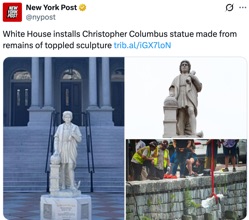 [Breitbart.com] A statue of Christopher Columbus was erected on the White House grounds outside the Eisenhower Executive Office Building on Sunday, a move that flies in the face of Black Lives Matter (BLM) leftists who tore down the original one in 2020. The replica statue was crafted with pieces of the monument the protesters toppled in Baltimore, Maryland, and threw into the city's harbor, the New York Post reported Sunday. ... "Unveiled in 1984 by President Ronald Reagan, destroyed in 2020 during civil unrest and revived by COPOMIAO and President Donald Trump, the Baltimore Columbus statue now stands on the White House grounds in celebration of Italian American history and culture," the organization said, noting it was also in celebration of America's upcoming 250th anniversary... Subscribe for free to Breaking Christian News here Click Here to read, and view photos. (Screengrab image: via X-New York Post)