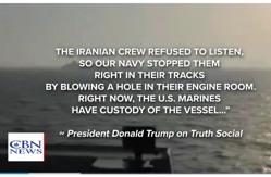 The US military took control of an Iranian ship that attempted to break the blockade in the Strait of Hormuz over the weekend. President Trump posted on Truth Social, "An Iranian-flagged ship named Touska, nearly 900 feet long and weighing almost as much as an aircraft carrier, tried to get past our naval blockade, and it did not go well for them." Trump continued, "The US Navy Guided Missile Destroyer USS Spruance intercepted the Touska in the Gulf of Oman and gave them fair warning to stop. The Iranian crew refused to listen, so our Navy stopped them right in their tracks by blowing a hole in their engine room. Right now, the US Marines have custody of the vessel..."